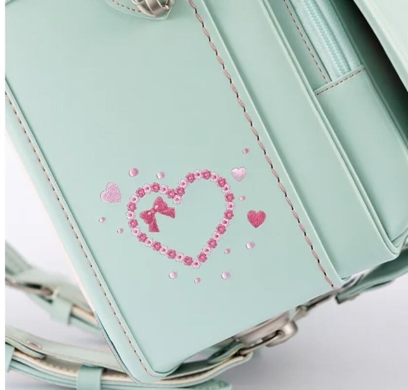 ハートがいっぱいの楽しいデザイン:刺繍や内装の柄はもちろん、ファスナーの引き手やポケットの形まで、たくさんのハートを散りばめました。「ハートが大好き!」というお子様の夢を叶えるランドセルです。